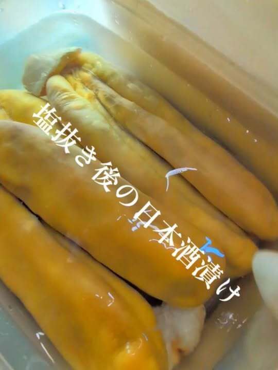 粗塩による脱水後、薄食塩水による塩抜きを経て、要となる日本酒漬け工程に移行しました。